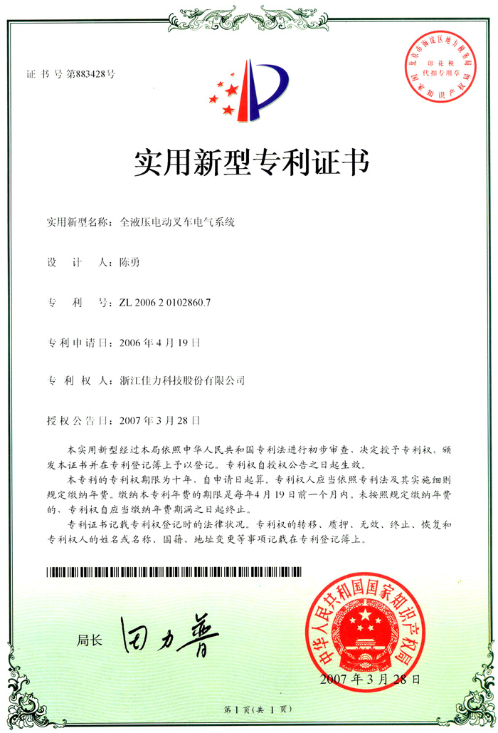 電氣系統(tǒng)專利證書